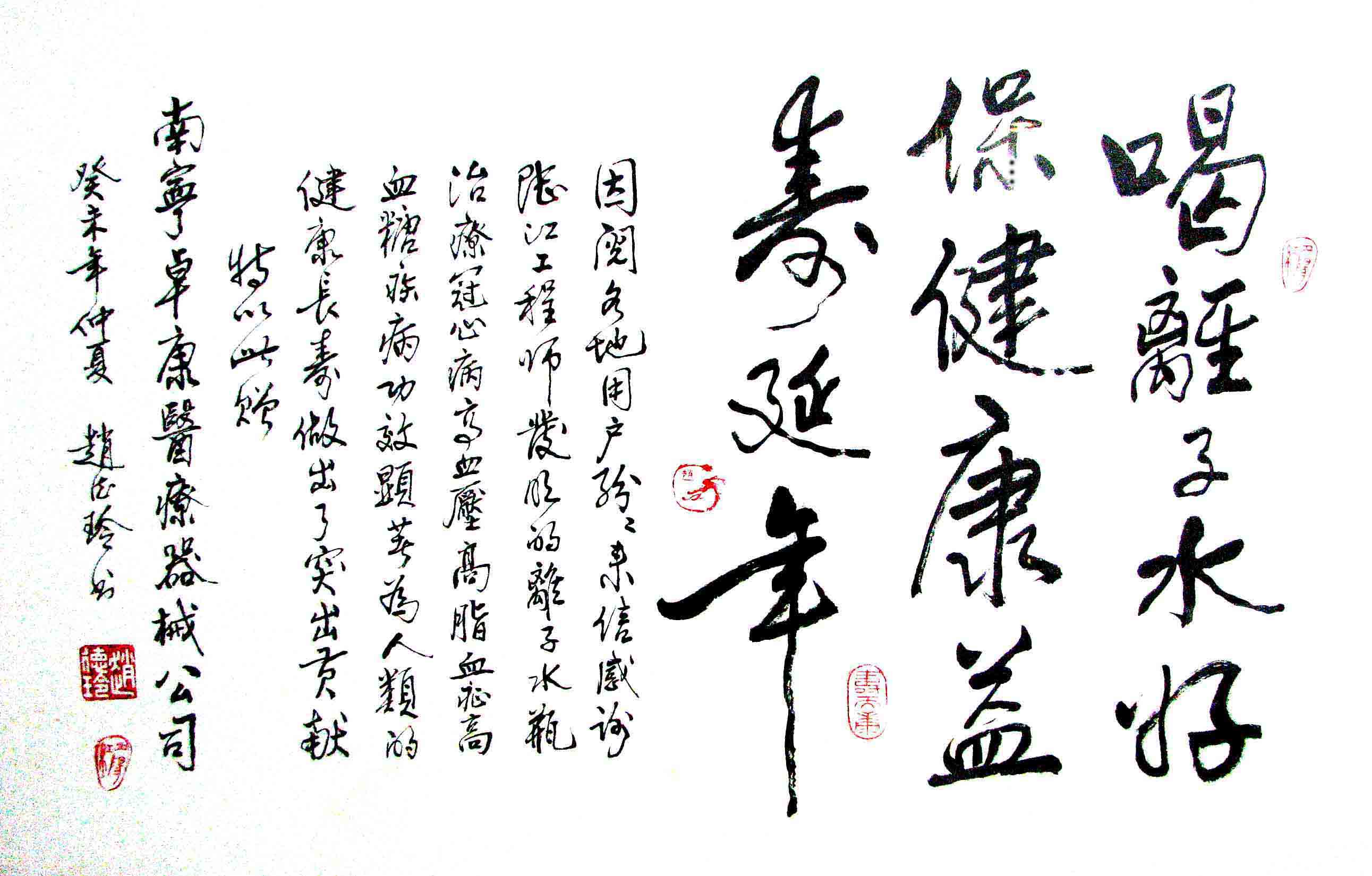 - -----南寧卓康微小水科技有限公司原為南寧卓康醫(yī)療器械有限責(zé)任公司 ,用戶普遍反饋高血壓患者飲用2—5個(gè)月,癥狀消除,不再服藥,治愈了高血壓; 冠心病患者,包括已做和未做支架或搭撟手術(shù)者,經(jīng)3—5個(gè)月飲用,消除心痛、胸悶、早搏、房顫和心絞痛等癥狀,逆轉(zhuǎn)至消除動(dòng)脈粥樣硬化和斑塊,一年左右治愈冠心病,心腦電圖正常,經(jīng)冠脈造影掃描無明顯狹窄,表明冠心病痊愈;糖尿病人飲用3-10個(gè)月,血糖尿糖正常,治愈2型糖尿病; 并且使前列腺增生、低血壓、腦萎慢性咽喉炎、慢性氣管炎、支氣管炎、哮喘、矽肺病、甲亢、慢性胃腸炎、膽囊炎、慢性腎炎、腎衰、風(fēng)濕性關(guān)節(jié)炎、痔瘡和濕疹皮炎及中風(fēng)癱瘓或偏癱失語后遺癥等不藥而愈,且多病同治,無需終生服藥,彌補(bǔ)了幾千年來藥物的欠缺,使“微小水”成為人類消除高血壓、冠心病和糖尿病的寶貴資源。腦動(dòng)脈粥樣硬化、低血壓和前列腺增生患者,一般飲用四個(gè)月痊愈;中風(fēng)后遺癥患者,一般飲用8個(gè)月痊愈。請(qǐng)?jiān)旈啞队脩舴答仭窓谀恐写罅炕颊叩姆答佇拧z測(cè)報(bào)告,有的還附照片。產(chǎn)品屢獲大獎(jiǎng),論文也屢獲一等獎(jiǎng)。廣大用戶好評(píng)不斷,有口皆碑。